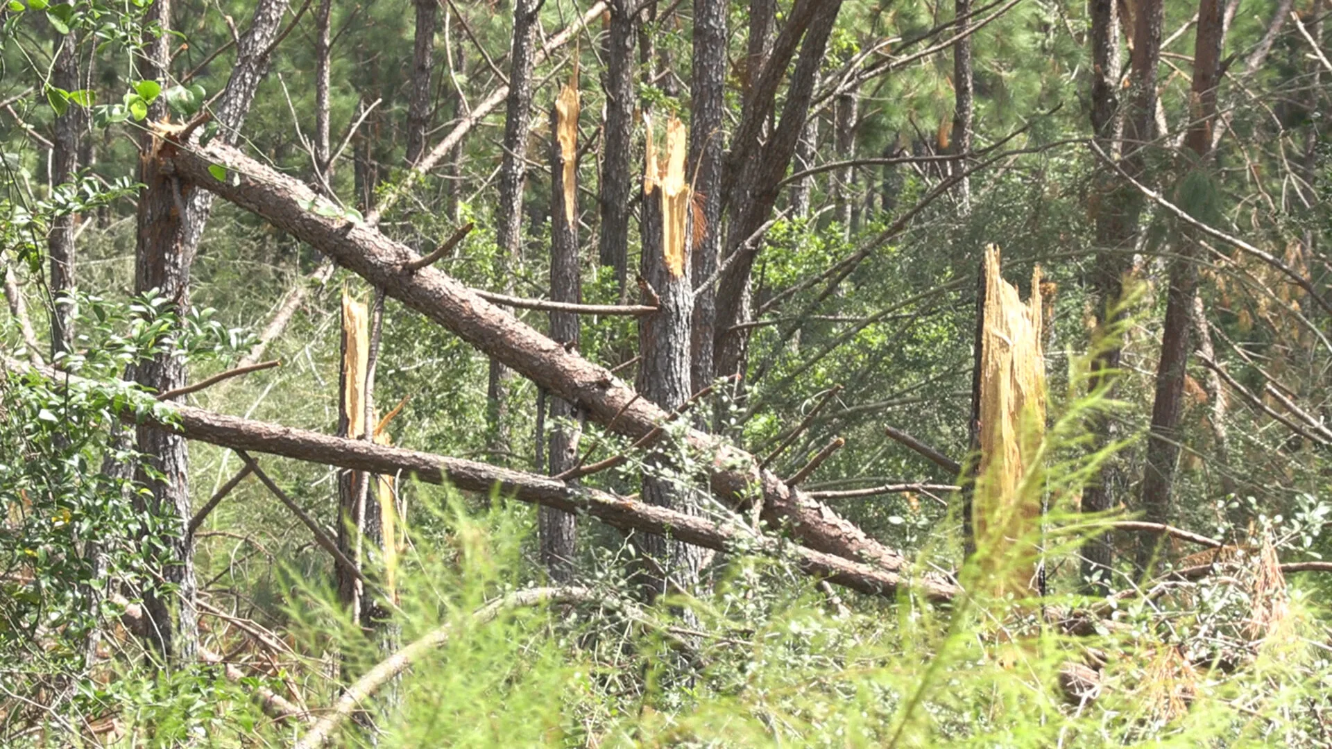 Snapped pine trees in Beauregard Parish following Hurricane Laura.