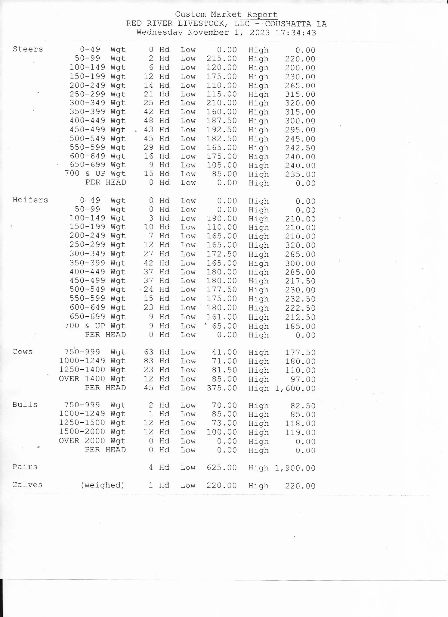 Red River Livestock Auction: November 1, 2023 LivestockAvery DavidsonNovember 1, 2023 Facebook0 Twitter LinkedIn0 Reddit Tumblr Pinterest0