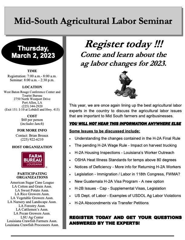 Please make plans to attend the 2023 Mid-South Agricultural Labor Seminar to be held on Thursday, March 2, 2023 at the West Baton Rouge Conference Center, 2750 North Westport Drive, Port Allen, LA 70767.