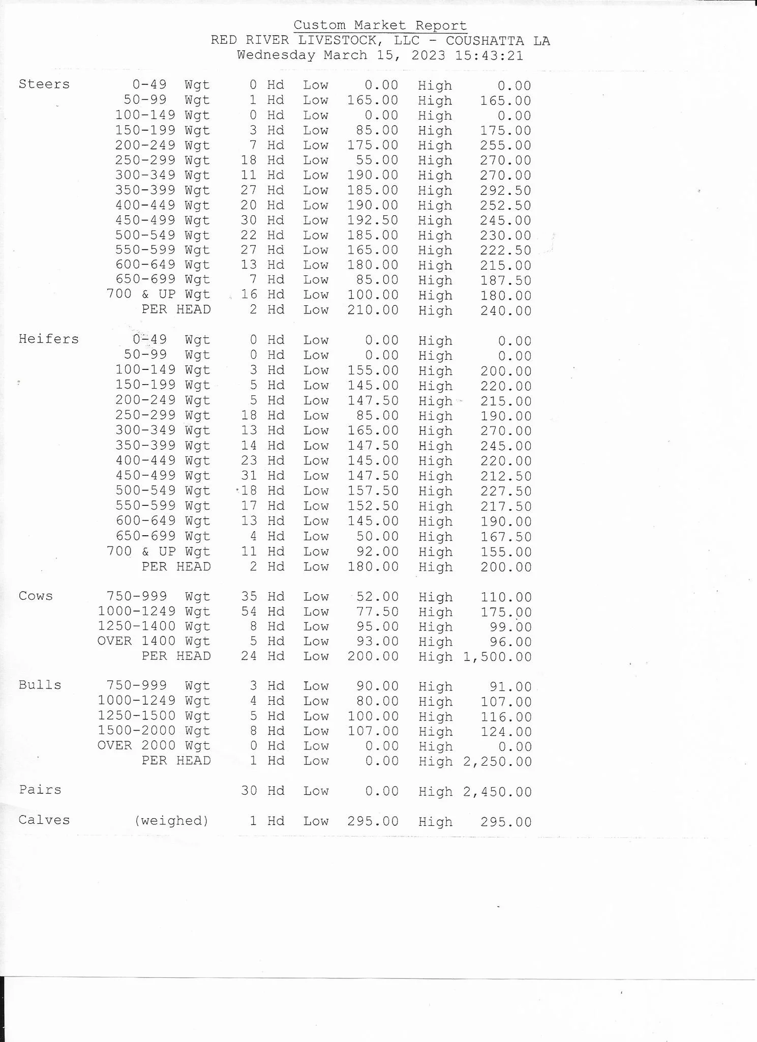 Red River Livestock Auction -- Wednesday, March 15, 2023 Livestockkristen oaksMarch 15, 2023 Facebook0 Twitter LinkedIn0 Reddit Tumblr Pinterest0