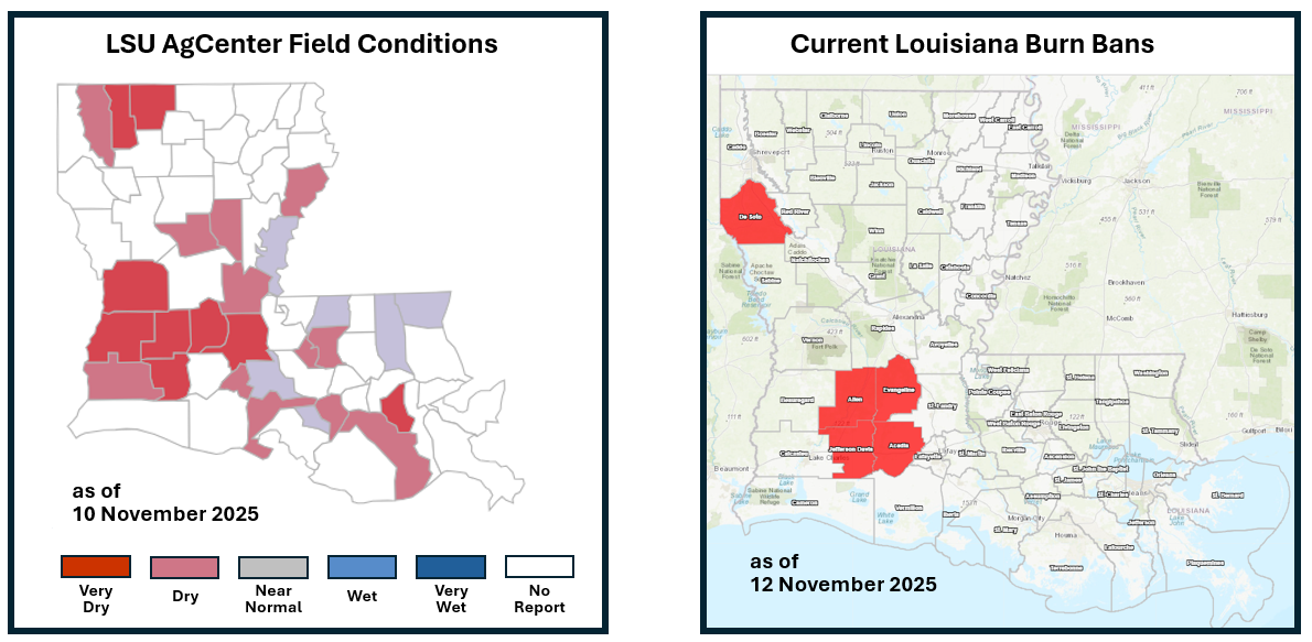 Note that many of the state’s parish ag agents are assisting in the drought-monitoring effort by submitting weekly assessments of field conditions for their service areas (LSU AgCenter Field Conditions). We hope that more agents will routinely contribute to this product in the coming weeks.