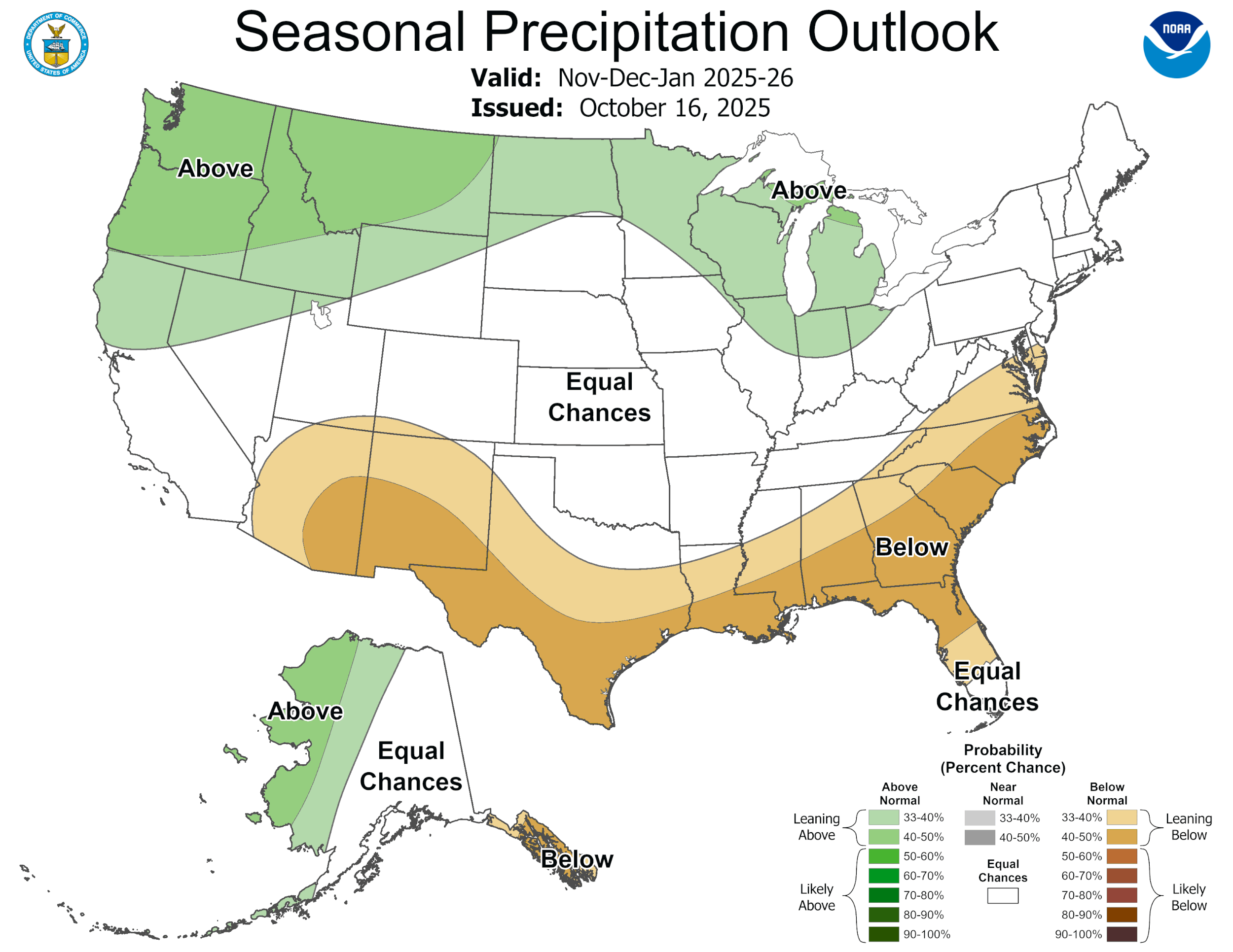 Also, the CPC’s outlook does not give us a sense of “how dry?” it will be in the coming months … nor any guidance as to “what the distribution of winter rainfall will look like?” users must be careful not to over-interpret this outlook tool. However, while the CPC outlook does not necessarily imply worsening drought in the coming weeks, it does not offer much hope for an end to current drought conditions either.