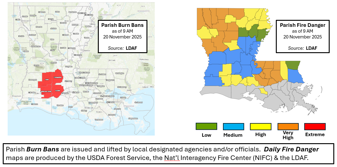 Keep in mind that the USDM evaluation combines a number of environmental measures of moisture availability (or stress) over varying time periods. It can be slow to acknowledge localized conditions, especially in the 'hit-or-miss' pattern of drought currently impacting Louisiana. That said, the LA Drought Team is keeping a close watch on deteriorating conditions, especially in ag & forestry dominated areas of the state.