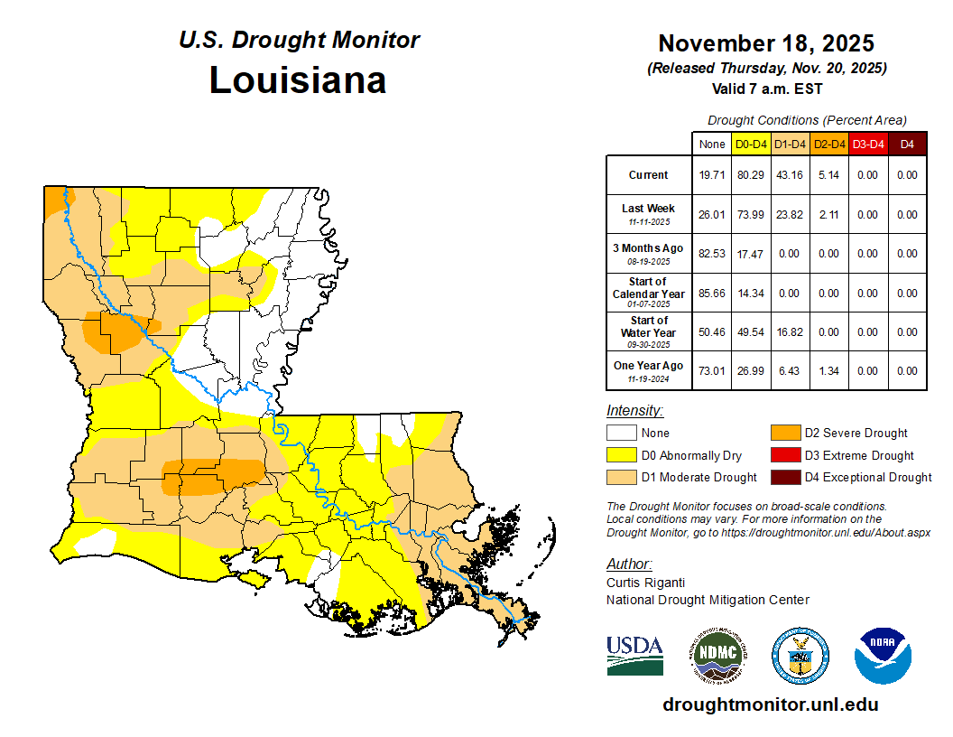 After a rain-free 7-day stretch for Louisiana (Nov 12-18), today's updated U.S. Drought Monitor (USDM) depiction for the Bayou State shows additional degradations with more than 40% of the state now posted as "in drought" (D1+D2).