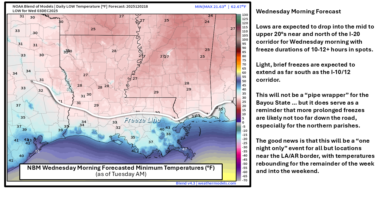 Mother Nature delivers a reminder that we are now in "meteorological winter" (Dec, Jan & Feb) with a freeze tonight into early Wednesday morning. Fortunately, this freeze will be just a "one-nighter" ... temps for Wednesday night/Thursday morning will be still by cold but should be above-freezing for all but possibly a few northernmost Louisiana communities.