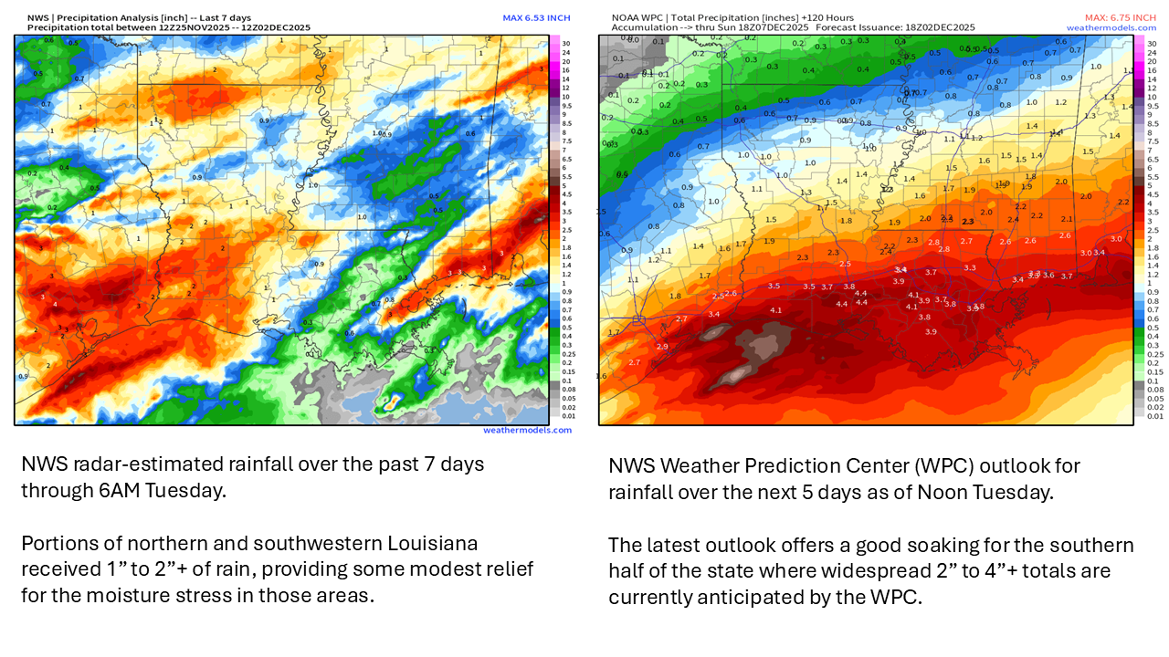 The latest projections posted by the WPC shows 3" to 4"+ from late Wednesday into early Saturday for areas south of the I-10/12 corridor ... sure to provide some relief for the dry-to-drought conditions there.
