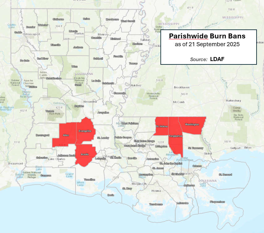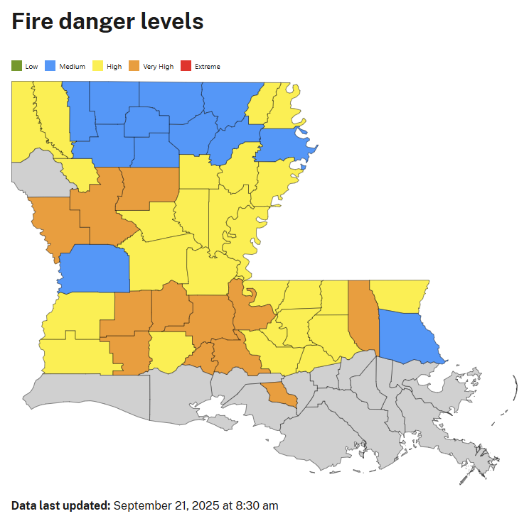 As of Saturday, 6 parishes have issued burn bans - including Washington Parish as the most recent. Those bans are in effect until further notice. Note the cluster of Acadiana parishes now categorized with a "Very High" wildfire danger.