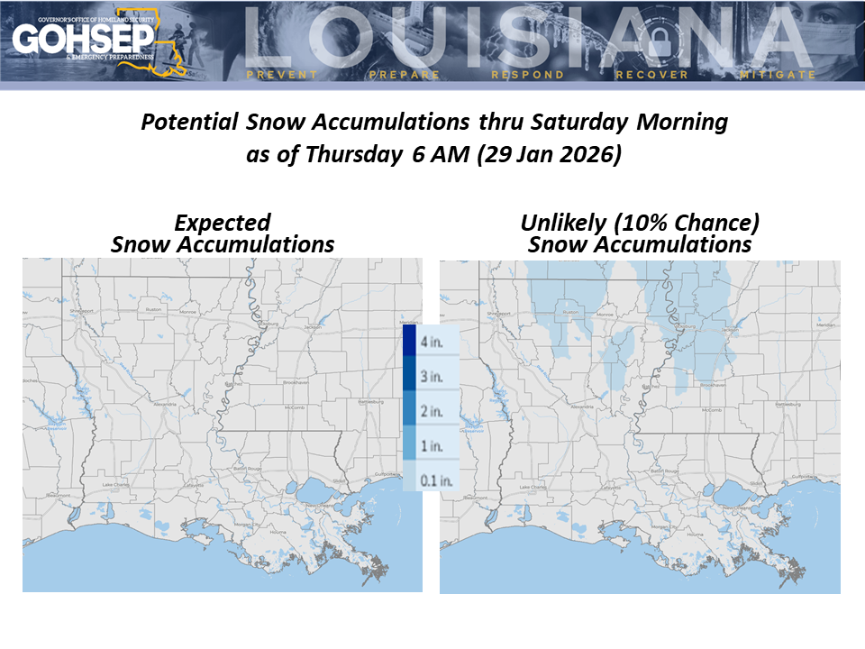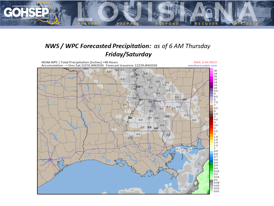 The one change to the outlook over the next 48 hours is a very low-end potential for flurries with little to no accumulations (trace to 0.1”) for a handful of northern parishes early Saturday morning (31 Jan). This will not add to current snow and ice issues.