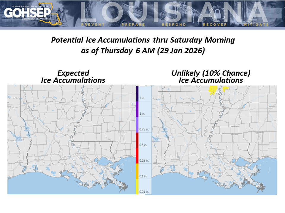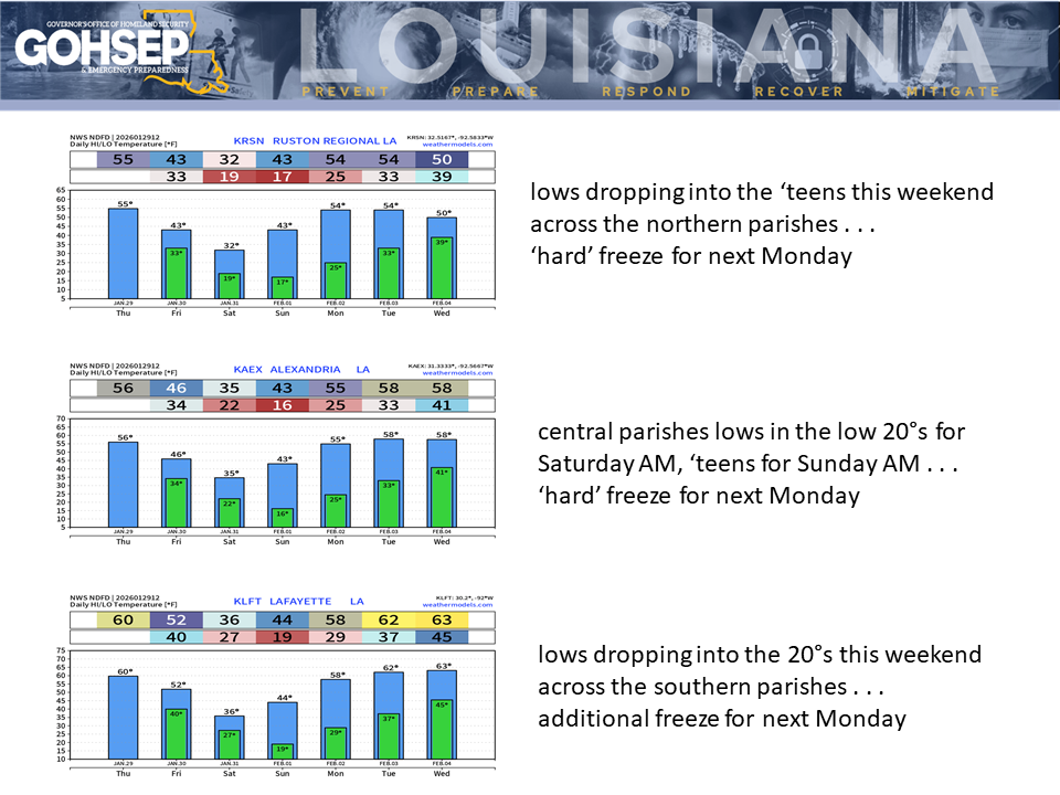 Much/most of northern Louisiana will get a light, brief freeze for Friday morning (30 Jan) with much chillier afternoon temperatures as the next Arctic air mass pushes its way across Louisiana. That will lead to another round of dangerously cold weather for the weekend.