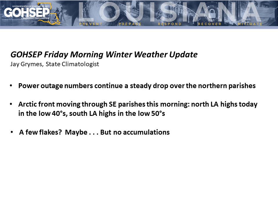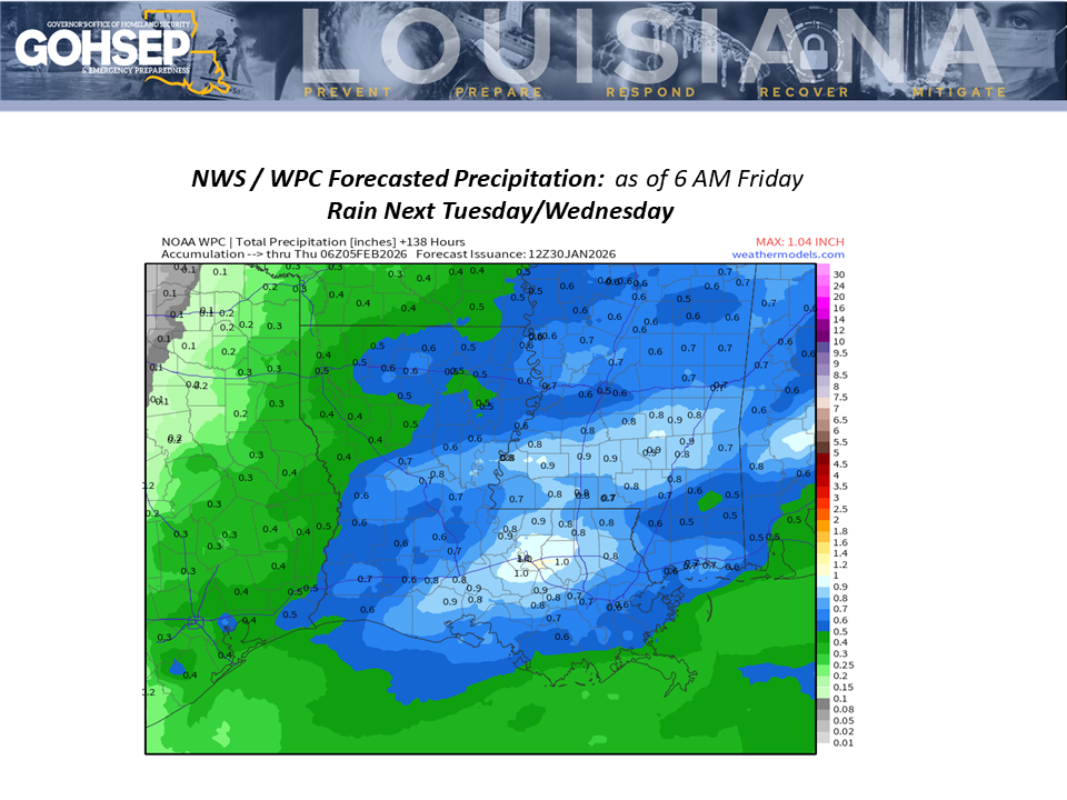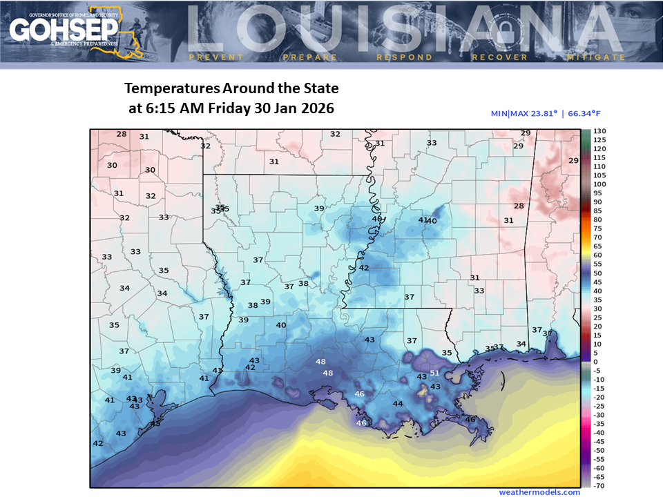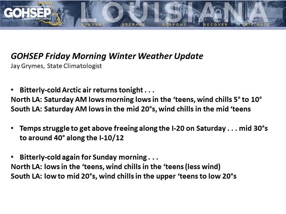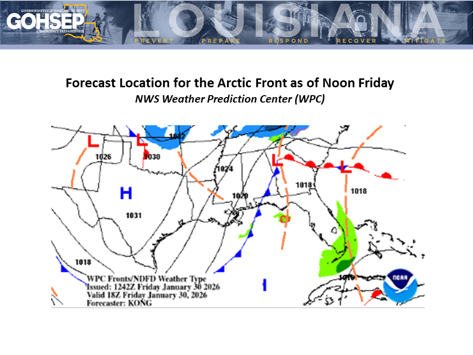 The full effects of the Arctic air mass arrive statewide before sun-up on Saturday morning (31 Jan 2026): bitterly-cold air will be augmented by northerly winds in the 10-20 mph range, pushing wind chills down into the single-digits for most northern parishes.