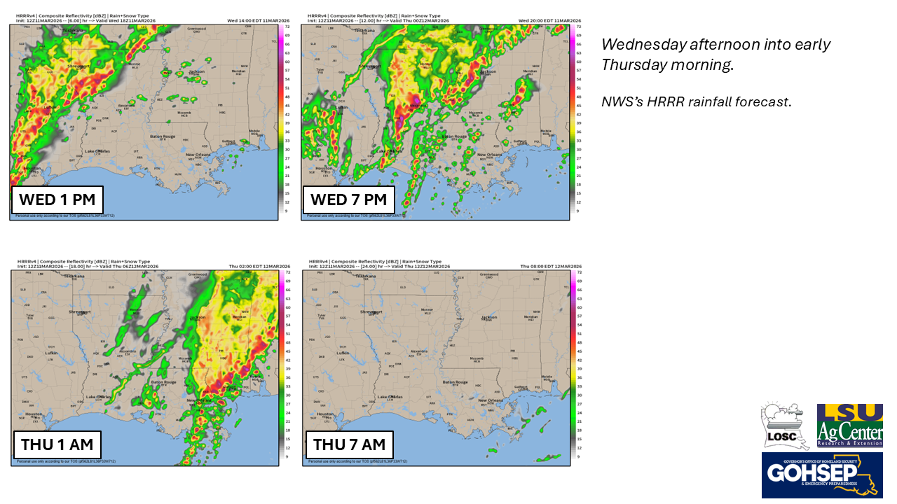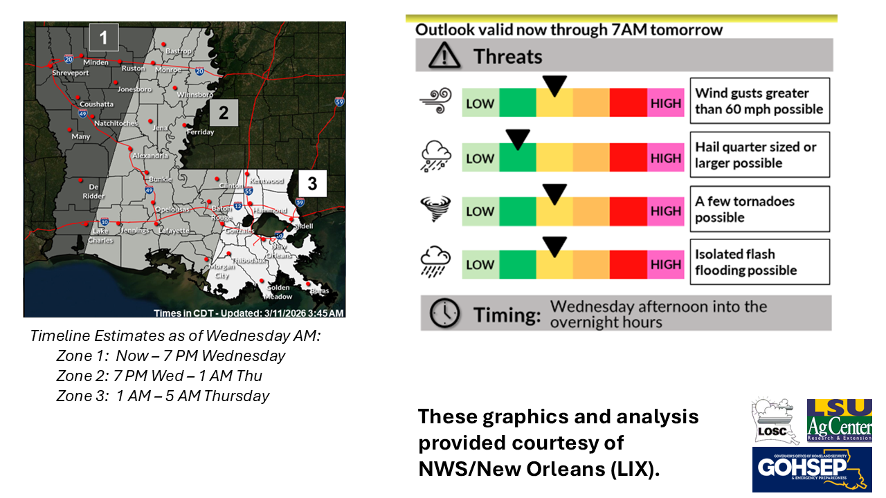 The SPC also has highlighted the potential for those tornadoes that do develop to achieve EF-1 or EF-2 intensities. The SPC also has increased the potential for damaging winds over a number of northern and eastern parishes.