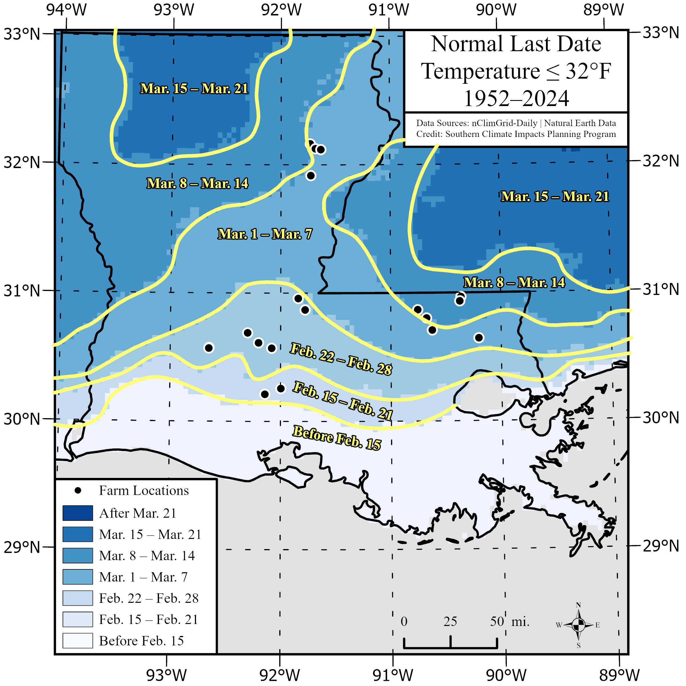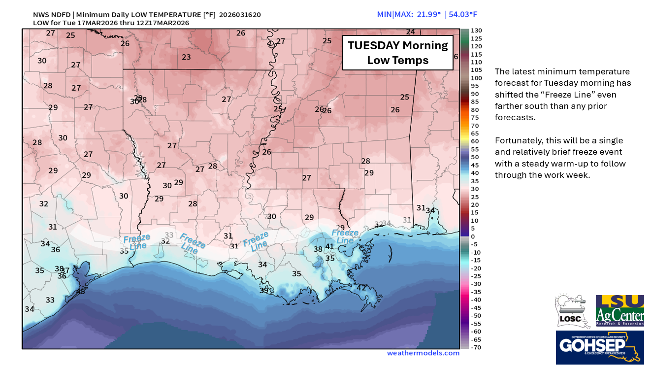 For northwestern Louisiana, a mid-March freeze is fairly common ... fitting around the "average" date of the last freeze of the season. But for the southern parishes, mid-March is leaning on the late side of the season for a freeze ... and is roughly a month behind the "average" last freeze date for the coastal parishes.